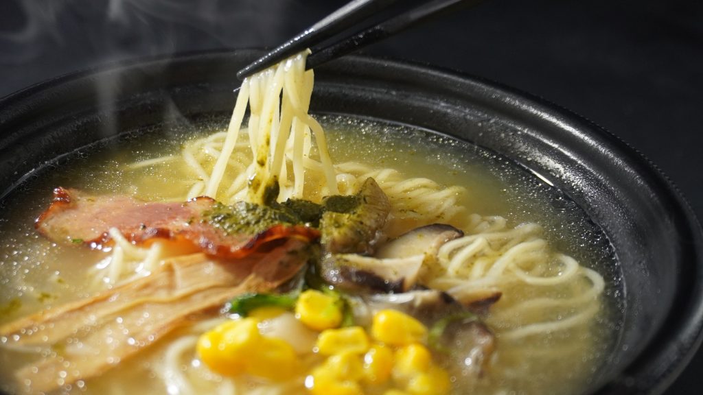 静岡県産の椎茸とネギを使い、そこに隠し味として抹茶を加えた構成になっています。抹茶のほろ苦さと塩のさっぱり感が合わさって、他にはない個性的な一杯に仕上がりました。